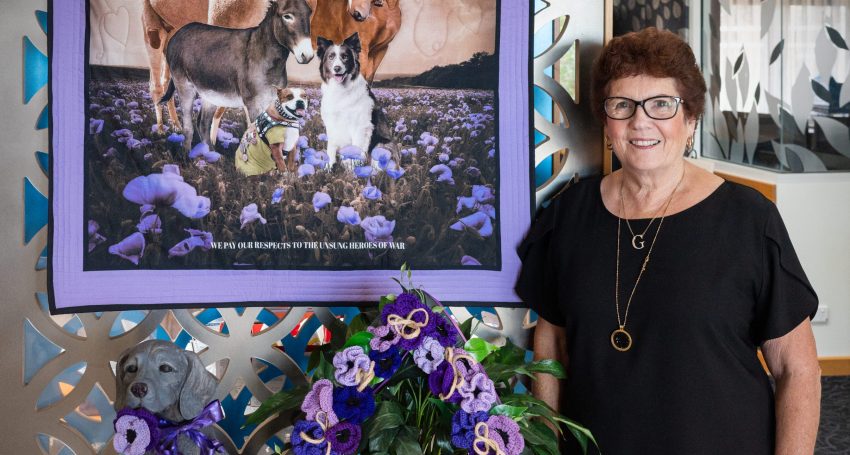 Gaylia enlisted the help of the Northern Yorke Peninsula Quilters who created a large quilt, picturing purple poppies, a camel, a horse, a donkey, dogs and a pigeon. A dog statue, and a wreath adorned with crochet purple poppies also formed part of the display.